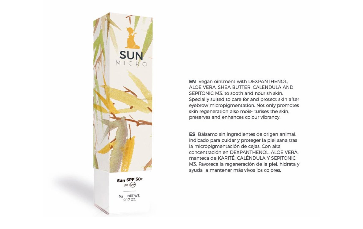 SUN MICRO SPF 50+ es un bálsamo vegano diseñado para el cuidado y protección de la piel después de tratamientos de micropigmentación de cejas. Su fórmula avanzada combina ingredientes calmantes e hidratantes que favorecen la regeneración de la piel y ayudan a mantener la intensidad del color.